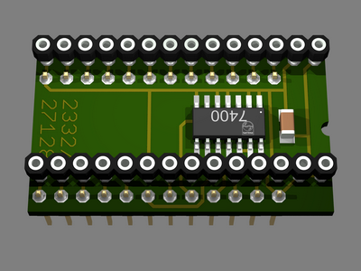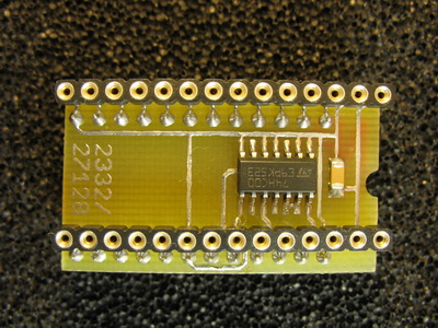 Dieser Adapter hilft beim Ersatz der oben aufgeführten nicht mehr erhältlichen originalen 2332-ROMs. Der Adapter wird in den Sockel der PET-Hauptplatine gesteckt und nimmt ein handelsübliches mit dem entsprechenden Code gebranntes EPROM des Typs 2764 oder 27128 ohne weitere Änderungen auf.