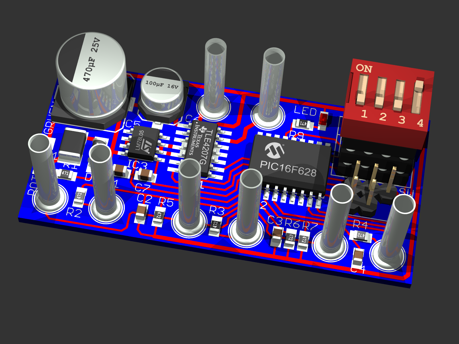 Hier wurden die Steuerungsaufgaben einem PIC16F628 von Microchip übertragen, und das nicht mehr erhältliche Motortreiber-IC TLE4205 wurde gegen den Nachfolger TLE4207 ersetzt. Abmessungen und Lage der Anschlüsse sind identisch mit dem Original-Modul, dabei konnte sogar eine nur einseitig ausgeführte Platine realisiert werden.