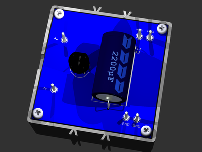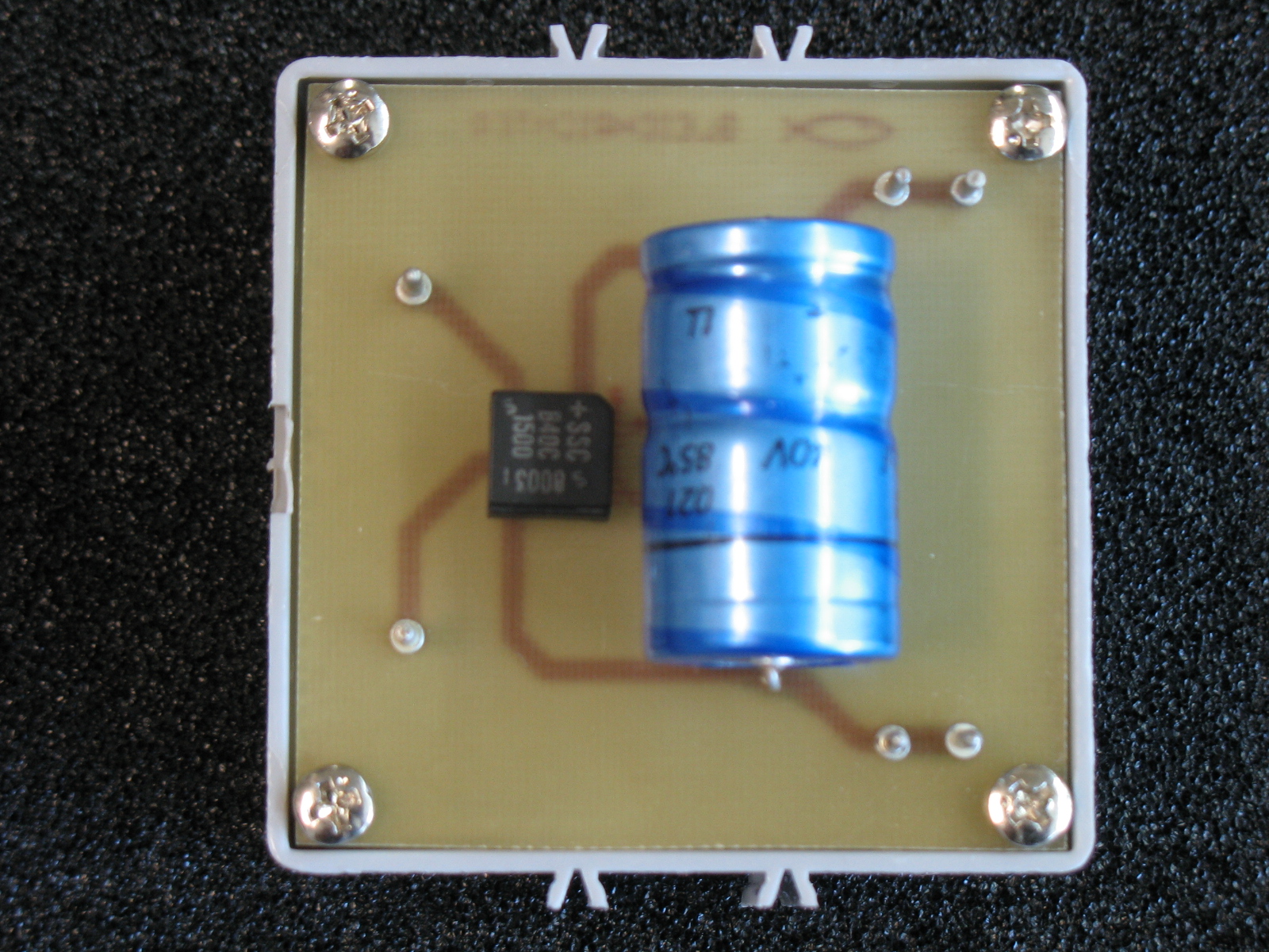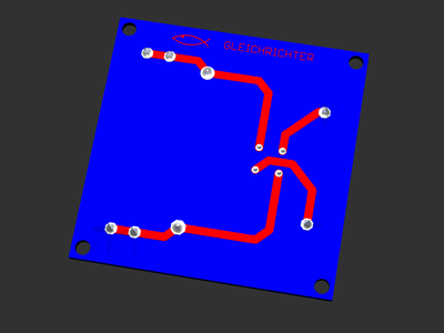 Der Gleichrichter Baustein besitzt die Eingänge ~ für Wechselstrom und die Ausgänge + und - der gleichgerichteten und geglätteten Gleichspannung.