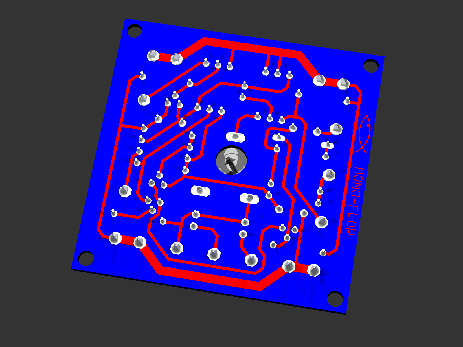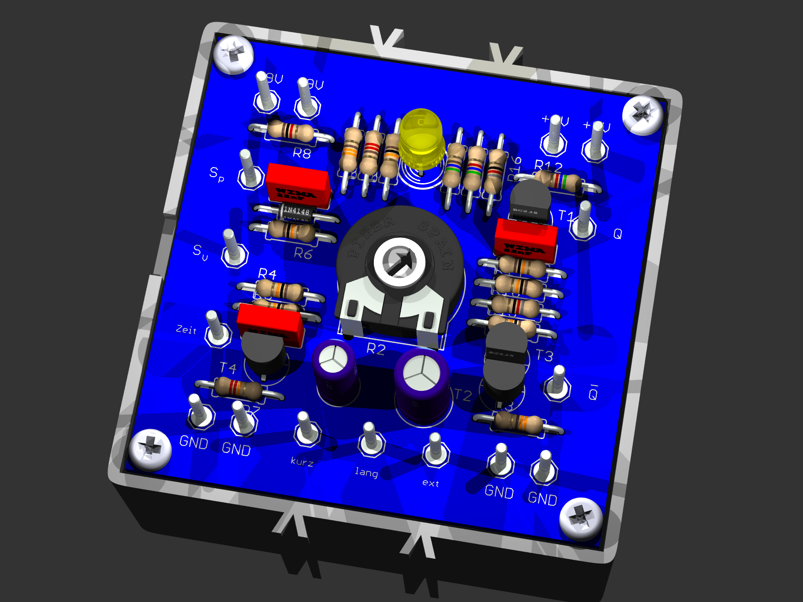 Das MONO-FLOP besitzt 2 Eingänge, SP und SV. Der Anschluß "Zeit" wird mit "kurz" oder "lang", oder über einen externen Kondensator verbunden. Ist keiner der beiden Eingänge beschaltet, so führt der Ausgang Q L-Pegel, der inverse Ausgang Q führt entsprechend H-Pegel. Auf einen L-H-Übergang am Eingang SP führt der Ausgang Q eine bestimmte Zeit H-Pegel, dann springt der Ausgang Q wieder auf L zurück. Die Dauer ist am Poti einstellbar. Mit dem zweiten Eingang SV kann man das MONO-FLOP sperren, dazu muss an SV L-Pegel anliegen.