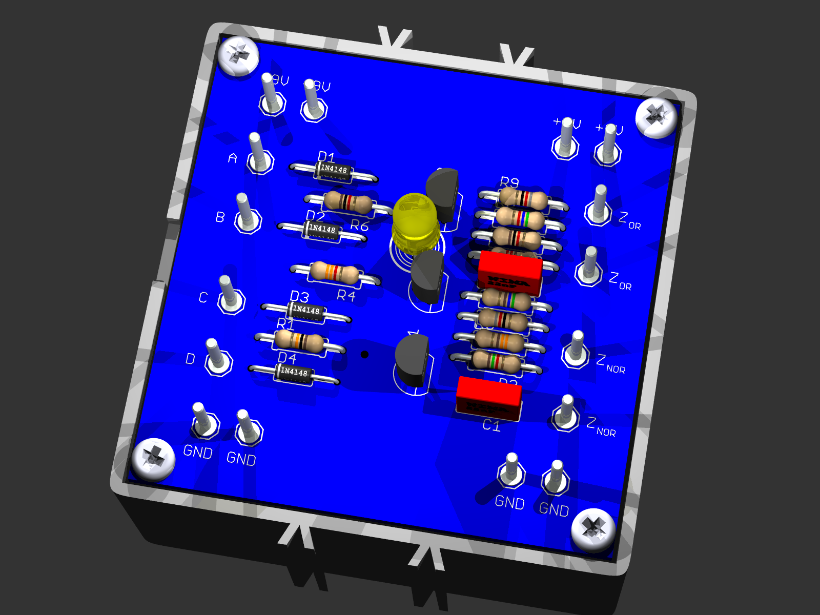 Dieser Baustein besitzt 4 Eingänge A, B, C und D. Die ODER-Bedingung verlangt, dass H-Pegel am Ausgang ZOR erscheinen muss, wenn mindestens an einem der Eingänge ein H-Pegel anliegt. Ausgang ZNOR ist invers zu ZOR.
